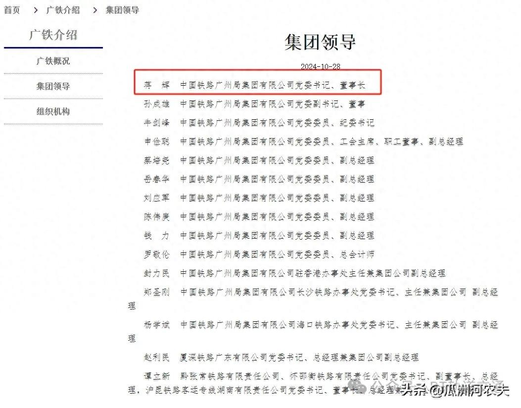 广州局集团公司官网显示,蒋辉任广州局集团公司党委书记、董事长。