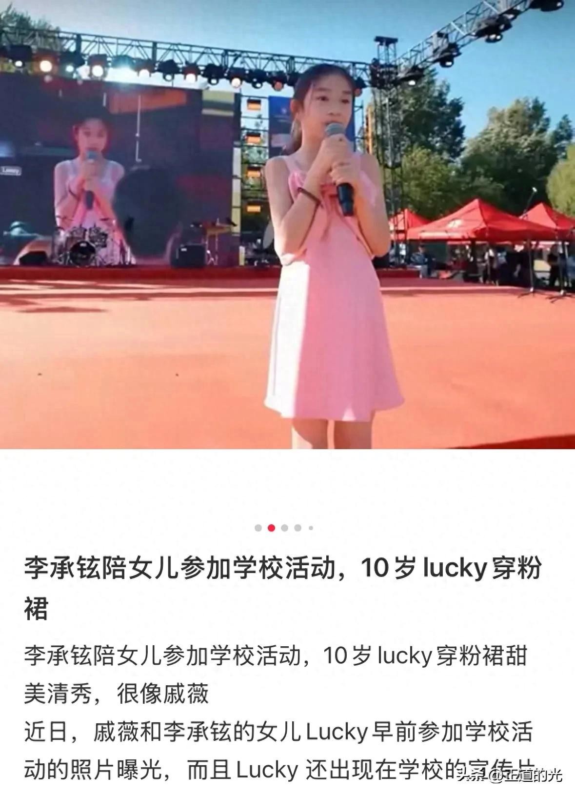 有网友晒出戚薇10岁女儿lucky参加学校活动,还爆料被放到学校的宣传片,李承铉也陪同女儿一起参加活动。