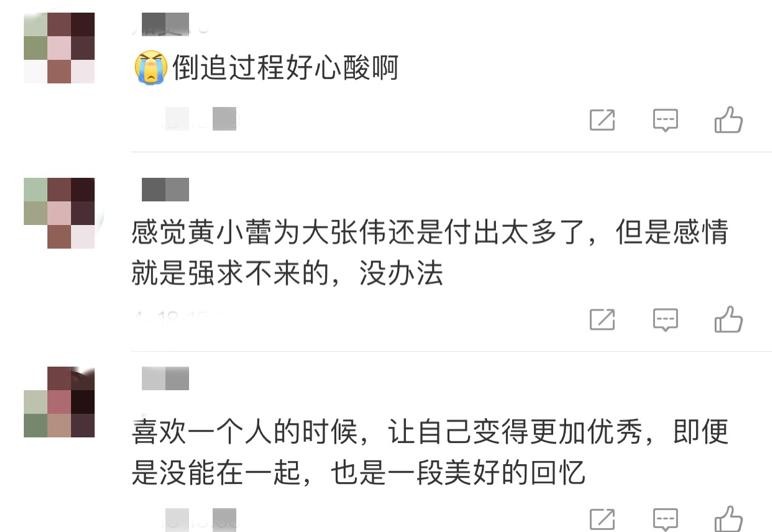 随后有人评论:“倒追过程好心酸啊。”还有人称:“感觉黄小蕾为大张伟还是付出太多了,但是感情就是强求不来的,没办法。”也有人表示:“喜欢一个人的时候,让自己变得更加优秀,即便是没能在一起,也是一段美好的回忆。”