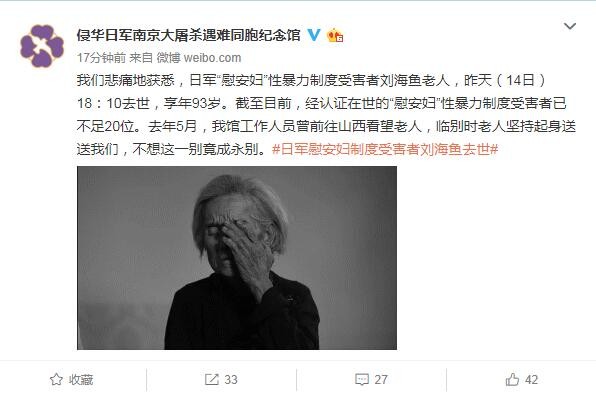 日军“慰安妇”制度受害者刘海鱼去世 经认证在世受害者已不足20人