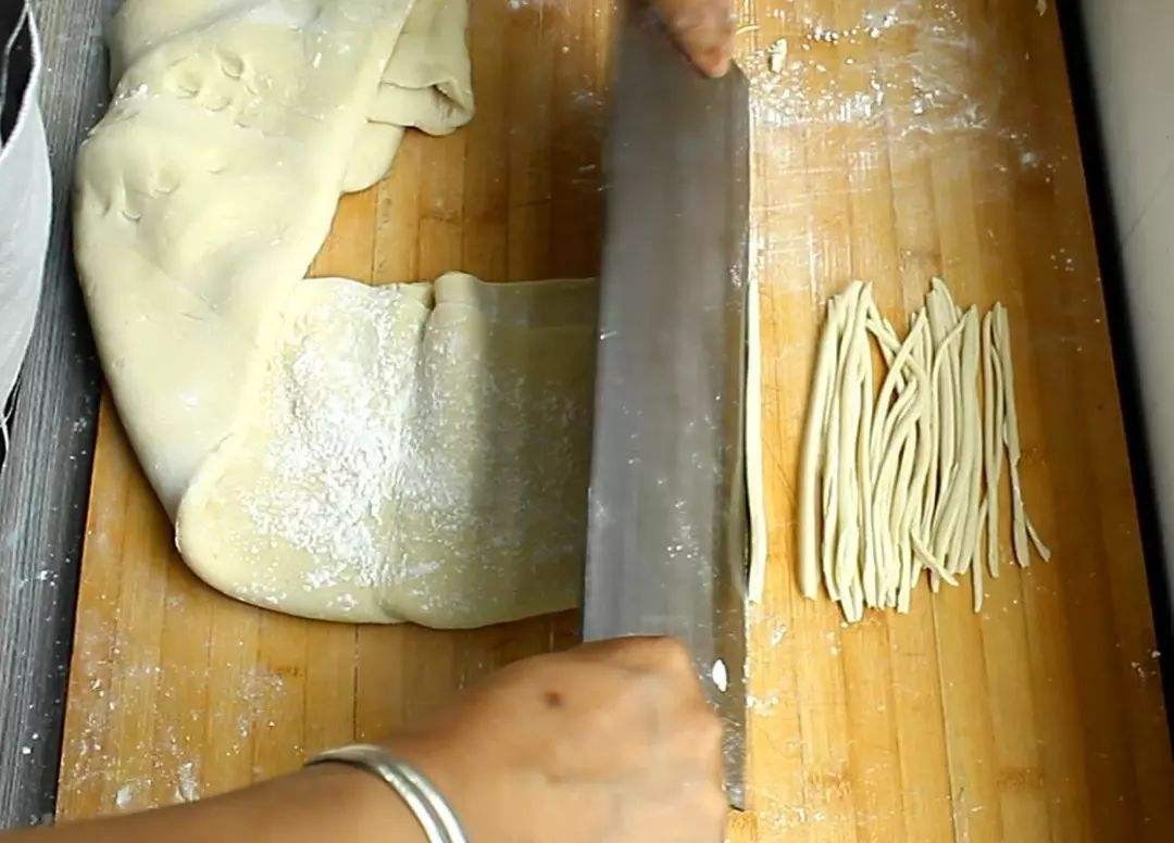 剔拨股将面团放在特制的铁、(木)铲上按扁,用铁筷(一根如普通香柱条粗的圆铁筷)将面一根一根地剔拨入锅内煮熟,俗称剔拨股。