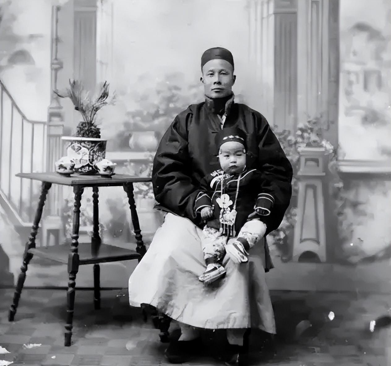 一位大户人家的男子和小孩的合影,这名男子在当时应该属于上层人士。