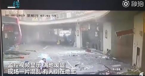现场监控视频显示,8月8日7时40分,三人散坐在画面右侧的店门口聊天,远处有人在清理垃圾,突然画面左侧发生爆炸,玻璃、门框等建筑碎块伴随着大量烟雾喷薄而出,待烟雾散去后,只能看到画面中1人捂住头部蹲在空地上。