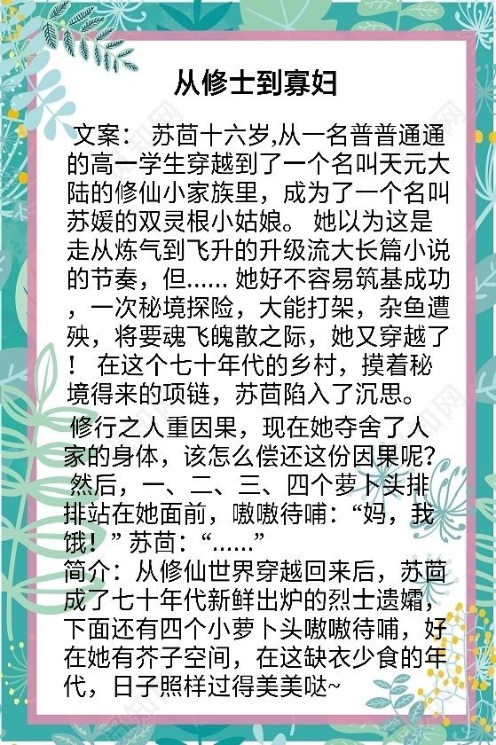 今天推荐的是:修士苏茴穿越到现代的七十年代,带着原主的四个儿子生活,将四个孩子培养成才,并不断的提升自己的修为。没有爱情,展现的是亲情,温馨美好。#小说#