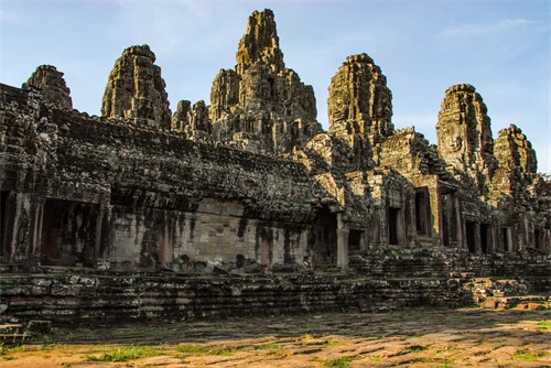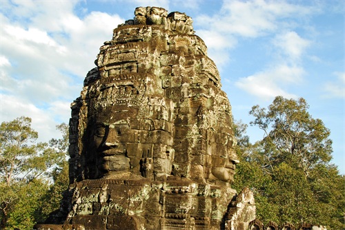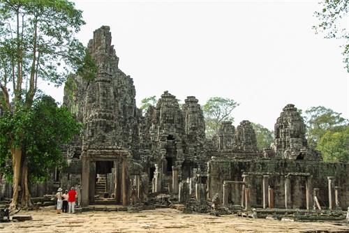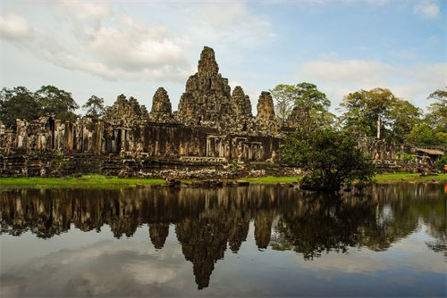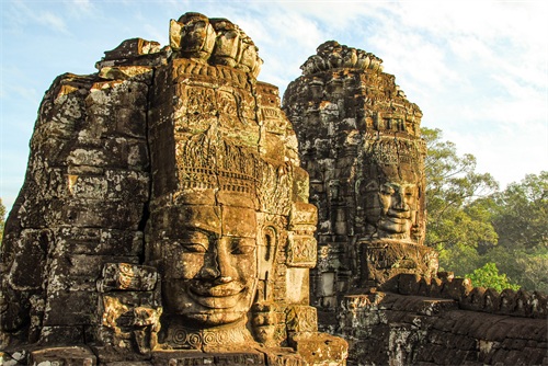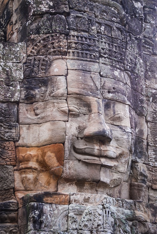 吴哥窟享誉世界,来到其所在地,柬埔寨暹粒省暹粒市,这才知道,它又叫小吴哥,只是整个吴哥古迹(俗称大吴哥)中极小的一部分。吴哥古迹现存600多处,分布在面积400余平方公里的森林里。作为高棉最强盛王朝的都城,吴哥始建于公元802年,完成于1201年,前后历时400年。1431年,暹罗(今泰国)人打过来,吴哥王朝被迫迁都金边,由此,宏伟辉煌的政治中心、宗教中心、艺术中心渐渐被热带雨林吞噬湮没,成为废墟,直到19世纪中叶才重见天日。考古学家把它与中国的长城、埃及的金字塔和印度尼西亚的婆罗浮屠并称为东方四大奇迹。1992年,联合国教科文组织把整个吴哥古迹列入世界文化遗产名录。目前,世界各国都在共同努力,保护和修复这一人类文化瑰宝。早在1998年,中国政府就派遣专业队伍参与了其中周萨神庙的保护修复,现在又在开展二期工程——茶胶寺的保护修复。 巴戎寺,又译巴扬寺,是吴哥古迹中唯一一座大乘佛教国家寺庙。它的54座四面佛塔高耸入云,200余尊巨型佛面雕像微笑着向四面八方俯瞰苍生。这就是享誉世界的“高棉的微笑”。当然,这些曾经闪耀着金色光芒的微笑面孔多数已经难以辨认。