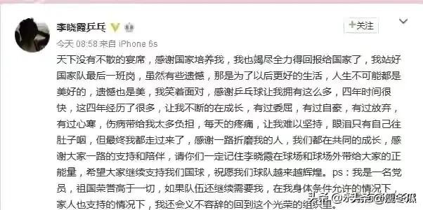 2016年里约奥运会之后,作为当时的国乒女队队长李晓霞毅然高调宣布退役,从她个人社交平台的发文来看,退役很坚决、很彻底、也很无奈,言语中有忿忿不平、有诸多抱怨、有暗自神伤。