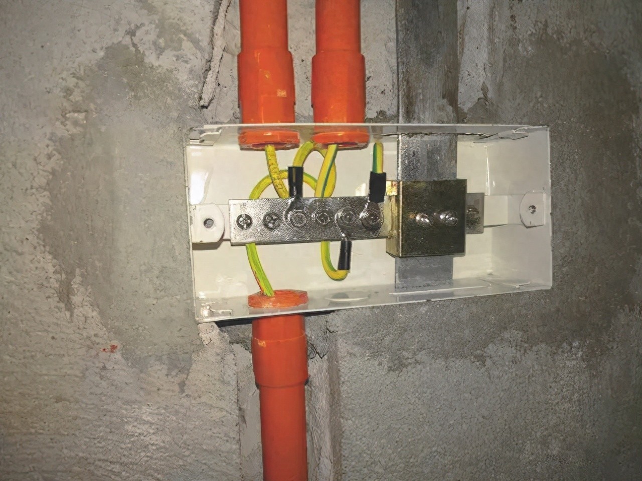 在后期砌墙的时候就把等电位端子箱安装到镀锌扁铁上,然后将等电位端子箱安装在墙体内,并留有相应的线管用来穿我们的连接线,这样就完成了卫生间内等电位的预埋。