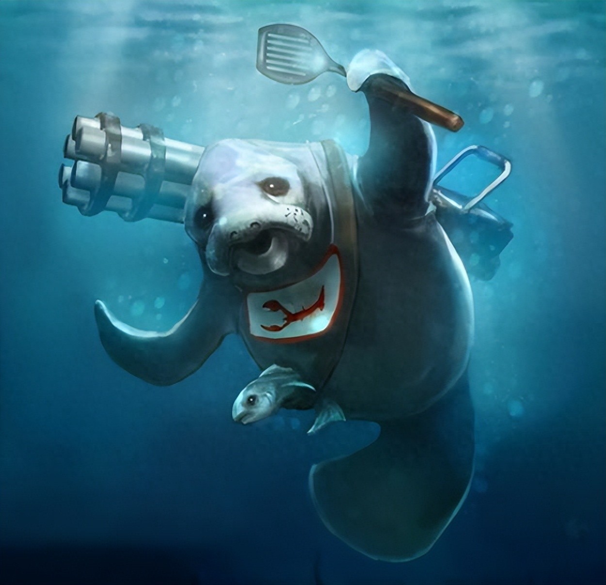 但是海牛阿福的戏份可没有从此消失,反而在后续的愚人节活动中都有过露相,出现在了飞机库奇和小鱼人的愚人节皮肤中。最后在2014年,联盟最火模式“无限火力”正式上线,其标志就是全身肌肉的海牛阿福。