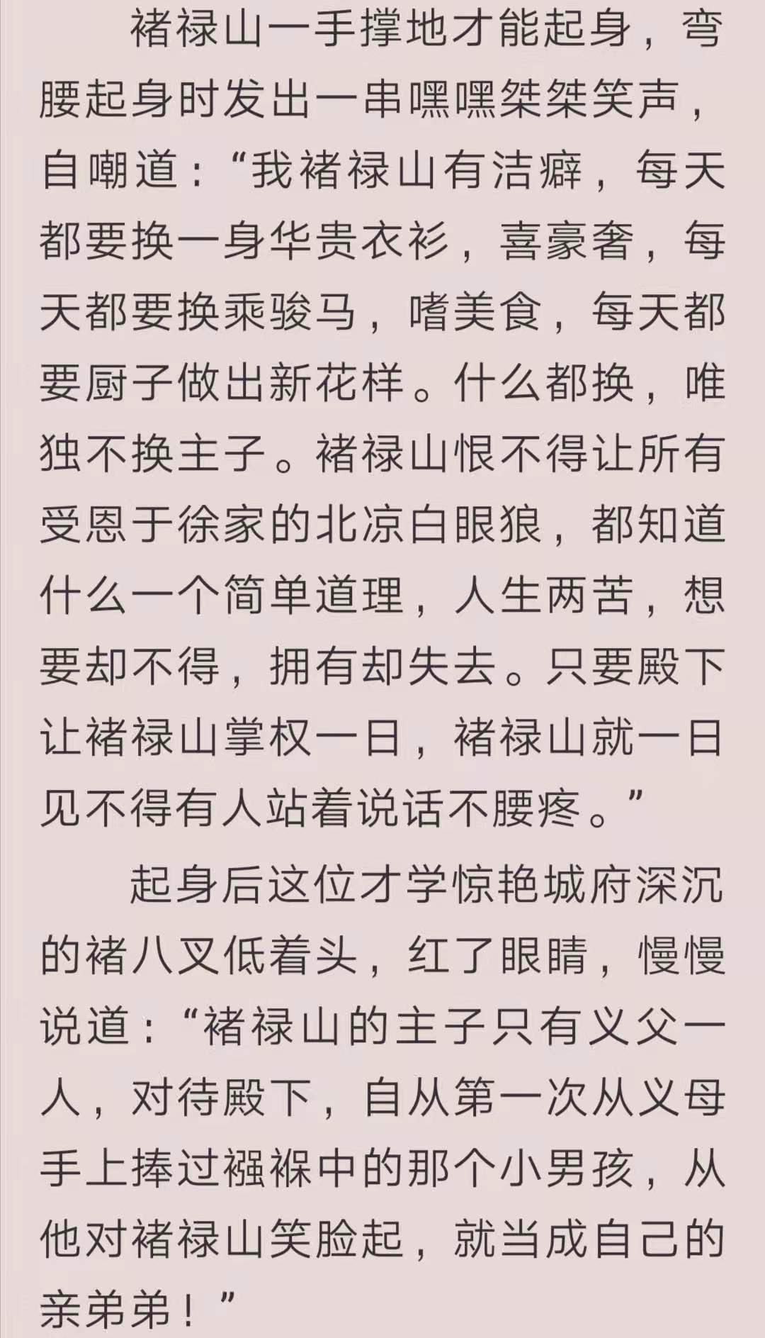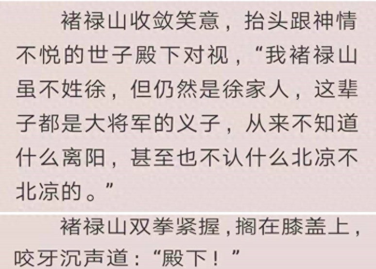 徐凤年让褚禄山以后别这样做,但是对徐凤年百依百顺的褚禄山,唯独这次没有答应徐凤年,选择了继续按照自己的方法行事。用褚禄山的话讲,他褚禄山不姓徐,但仍然是徐家的人,这辈子都是徐骁的义子,不知道离阳,甚至不认北凉,他只认徐家。