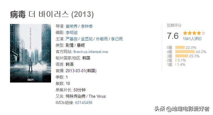 3、《病毒》;延续“致命性病毒+利益阴谋结合+打不死的小强”的固定套路设定。开头很紧凑,中间有些拖沓,结尾收的不俗,虽然实质性的剖析浅尝辄止,有些脸谱化,但还是赞一下主创针砭时弊的胆略。严基俊饰演这种“与时间赛跑,与未知拼命”的角色,也算是真选对了人。