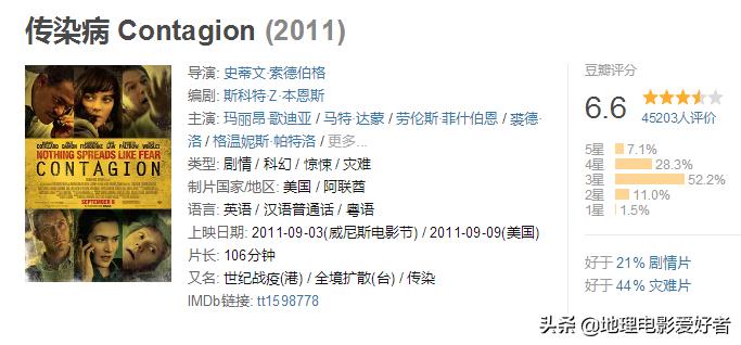 2、《传染病》;在国内疫情蔓延到举国上下一片恐慌中看了这部片儿,先不说电影拍的怎样,单是细节几乎完全对应现实,浑身鸡皮疙瘩。一样的配方,一样的味道,阳光之下无新事。虽然有点虎头蛇尾,但是现在这个时期观看相当应景,明星阵容强大。