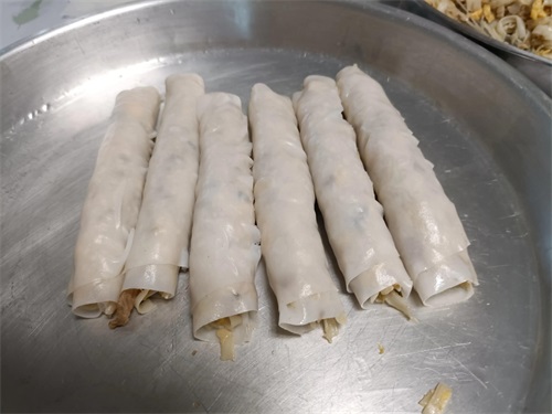 猪肠碌皮和猪肠碌馅(炒好的鸡蛋丝、绿豆芽、猪肉丝、阳江粉皮)