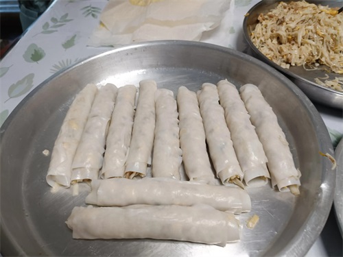 5:洗干净手,或者是戴手套把猪肠碌馅铺到猪肠碌皮上卷起来就完成;然后刷上花生油;喜欢吃葱跟芝麻的可以把葱花跟芝麻撒上就可以开吃了,喜欢吃香口一点的可以把猪肠碌用平底锅煎一下也可以。