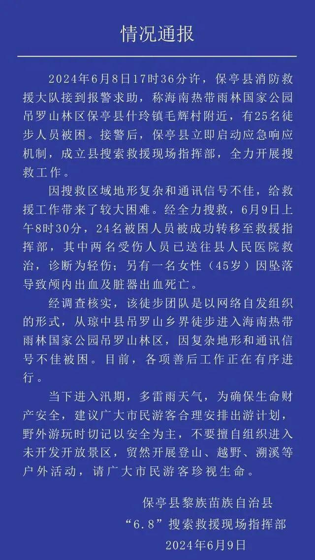 6 月 9 日,海南省保亭黎族苗族自治县发布情况通报:接警后,保亭县立即启动应急响应机制,成立县搜索救援现场指挥部,全力开展搜救工作。