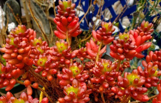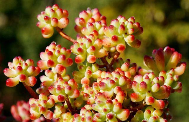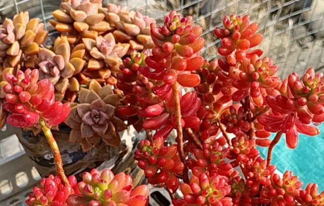 此外虹之玉和乙女心不耐暴晒,夏季气温过高的情况下需要遮阴,要不然它们的叶片就会出现晒伤。不过又不能遮阴过度,上午10点之前和下午4点之后还是要晒晒太阳,如此方可避免它们出现徒长。虹之玉和乙女心浇水跟其它多肉一样,平常保持干土浇透的频率即可,夏季开始遮阴的时候一并控水,而冬季气温低至5℃的时候亦是如此(0℃以下需收进室内养护)。