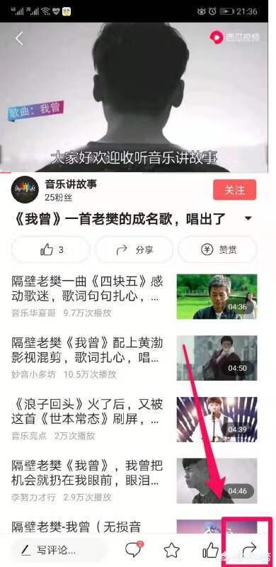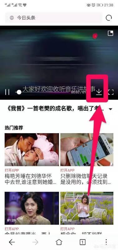 2、进入到今日头条,随意打开一个歌曲视频,然后点击下方的“向右箭头”,如下图所示。