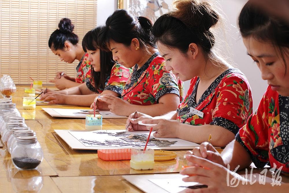 粮画小镇采取“公司+农户+基地”模式,由农户制作粮画,公司统一对外销售,辐射带动周边10余个村庄通过粮画产业增收致富。图为粮画姑娘制作粮画。王西军 摄