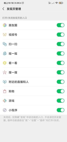 然后您就会看到下面的这个页面,把朋友圈那一个开关关闭就可以了。然后你在APP里面就找不到朋友圈这个入口了,一步到位。