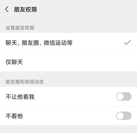 设置朋友圈权限那一栏,如果勾选第一行,那么你们之间就可以进行聊天,互相看到朋友圈,微信运动等互动内容,如果勾选第二行仅聊天,那么你们之间就像发短信一下,除了发消息,其他都彼此看不到,保持最单纯的关系。