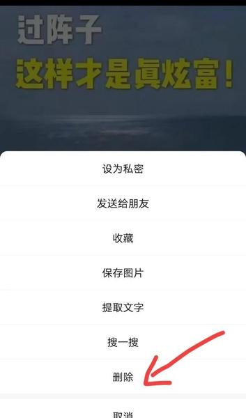 这个主要针对带有图片或者视频的朋友圈删除,如果是针对仅发送的文字的,或者转发的链接,点到想删除的那一条,他的底下就会显示一个删除,直接删除就可以了。