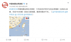 中国地震台网正式测定:11月26日07时57分在台湾海峡(北纬23.28度,东经118.60度)发生6.2级地震,震源深度20千米。