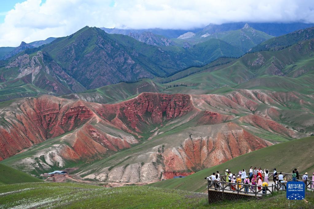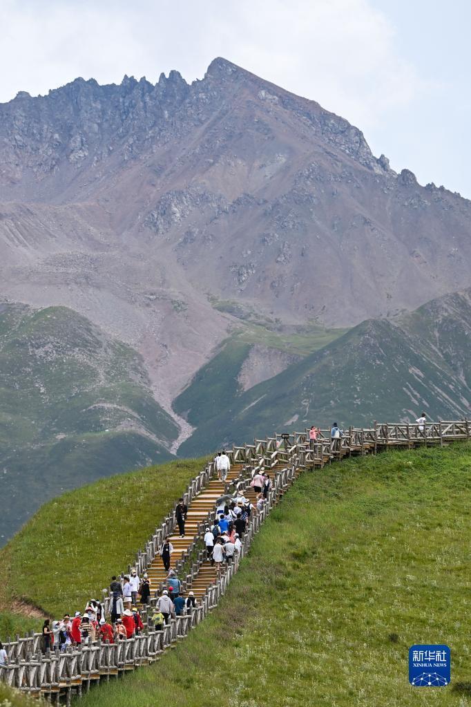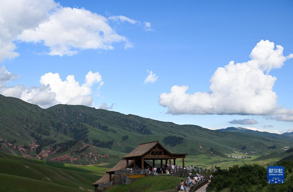8月10日,游客在青海省海北藏族自治州祁连县卓尔山景区内游玩。进入8月,位于青海省海北藏族自治州的祁连县气候清爽宜人,一望无际的草原、缭绕的白云,呈现出大西北独具特色的美景。暑期,祁连县在做好疫情常态化防控的前提下,积极推进旅游产业复苏,月均接待游客突破40万。新华社记者 张龙 摄