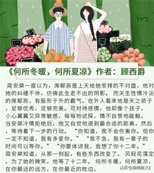 《何所冬暖,何所夏凉》作者:顾西爵简评:虐恋情深,书的前三分之一有点虐,喜欢女主那种小心翼翼的害怕。男主对女主一往而情深,没有放弃,一切寻寻渐进,那么刚刚好。里有一句话,你微微笑着,不同我说什么话。而我觉得,为了这个,我已经等待很久了