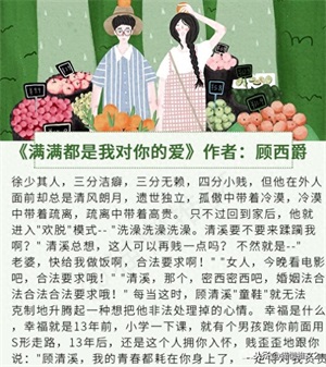 《满满都是我对你的爱》作者:顾西爵简评:青梅竹马,从小互相陪伴到老,作者大大的半自传体小说。亲情,友情,爱情,暖萌细腻,搞笑中透着温情。年少恋爱,吵吵闹闹,婚前耍流、氓婚后刷下限。亲情是上天赐的最大的缘分,友情是你想要回去的那一段共同时光,爱情,是一辈子的约定。