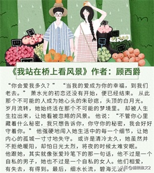 《我站在桥上看风景》作者:顾西爵简评:你会爱我多久?当我的爱成为你的幸福,到我们老去。和顾漫《骄阳似我》一样让无数粉丝翘首以待,男主章峥岚和女主萧水光,从一开始的女主心心念念的都只有自己的青梅竹马隔壁家哥哥于景岚,因为他的死更让女主无法接受其他人,一直以来心里都只有他的位置。在经过男主软磨硬泡的超级不要脸倒贴的追求后,终于肯尝试的接受男主了。可是她和他都认为她的心里一直都只是于景岚而没有他。男主一开始还是锲而不舍的,不在意女主心里到底有没有他,只求能和女主在一起,在她身边陪伴她,可是女主就是不开窍啊,一直以来都以为自己只想着于景岚,就错过了男主这样一个为了她能放弃一切的主。后来男主终于要放过女主了,说出不爱她了,可是那时候刚好是女主搞清楚自己的心的时候。就是这样的两个人错过了彼此,幸好最后的结局是好的,最终还是能在一起。