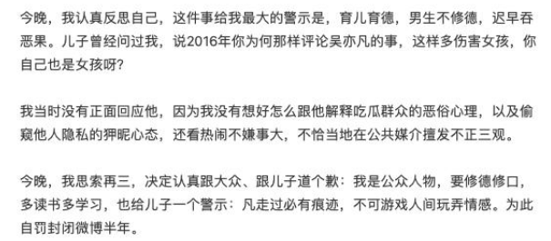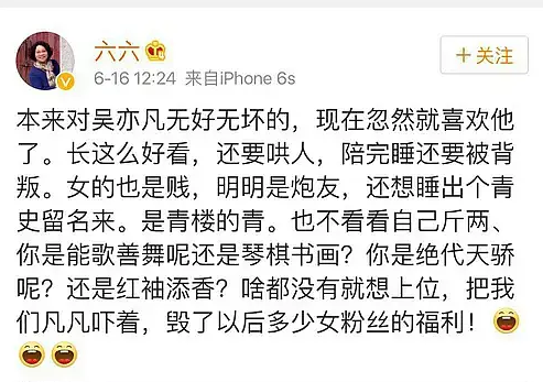 事后,六六公开道歉,她表示之前是以吃瓜的心态评论,事后才觉得自己言论过于激进,无形间伤害到很多人,六六决定关闭微博半年。