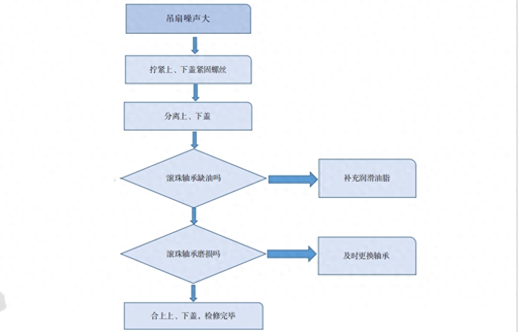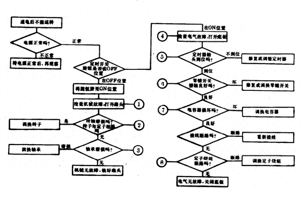 也可以观察运转情况如转速有否不正常,电机是否发出异声或放出焦味等,如果有这类情况,则说明电机内部有问题。检查电扇的构造目的是弄清其启动形式、调速方式以及摇头方式等。检查有关的零件如风叶、 转子轴有否变形和弯曲等。检查电机的绝缘情况如绕组有否短路或断路,转子有否断排等。下面,我们就电扇一些典型的常见故障,分别介绍其检查与排除的方法,一般操作流程及步骤如下图。