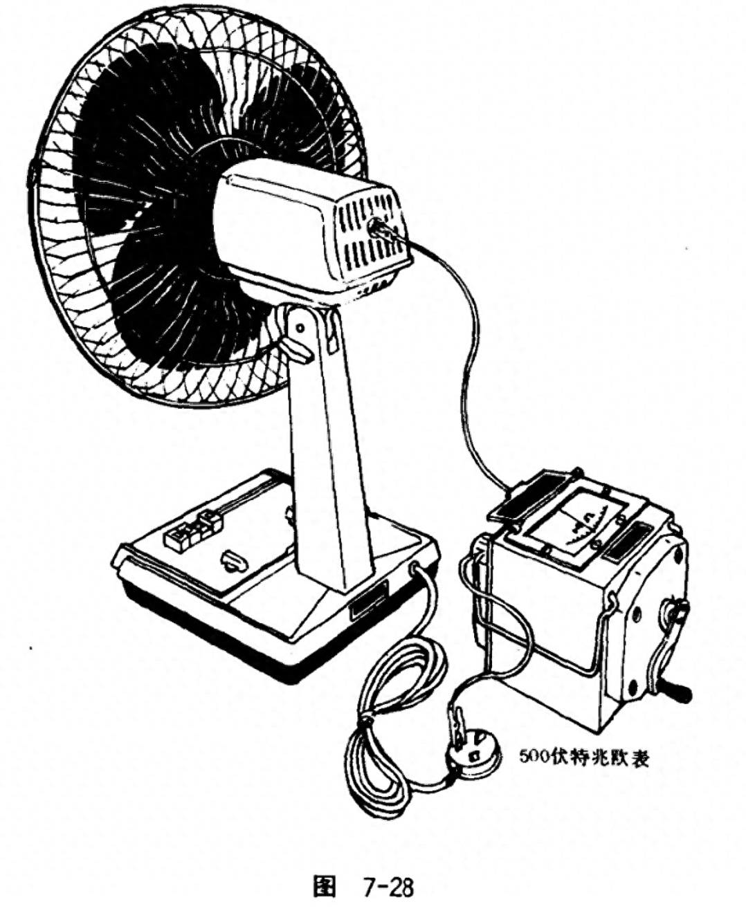 检查电扇外壳是否带电, 一般都使用兆欧表。具体方法为:将兆欧表的两根探棒一根接电扇外壳的金属部位,另一根接电源线的进电端,并合上琴键开关、定时器等所有电气控制件的触点,然后摇动兆欧表进行测试。测试数值要求> 2Mn。若<2MN,则表明绝缘性能不良,若等于0,则判为外壳带电。见图7-28。