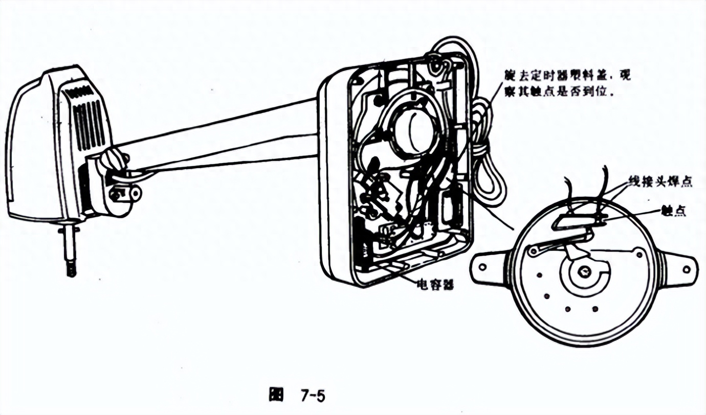定时器时走时停大多由触点接触不良所引起,修复时,可调整触头的压力,见图7-5。此外,若其主轴磨损严重而导致时走时停,就需更换整个定时器。