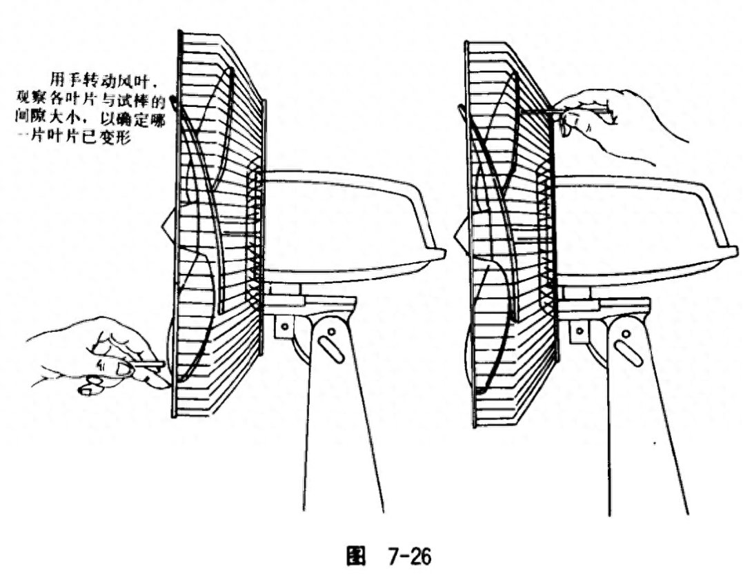 对于风叶的校正,可照图7-26与图7-27来进行。在着手校正前,风叶的前、后两面都应作检查。在扳动风叶时,手应顺叶片的成形方向进行操作,并且用力不可太大。经过校正后,振动依然存在,说明各叶片之间的重量不一致,需要调换整个风叶。此外,如果转轴轴伸端弯曲,轴承严重磨损(造成间隙太大)以及风叶套简与转轴配合松动等,也会引起电扇振动。修理时,可对这些部位逐一进行检查,并更换相应的部件。