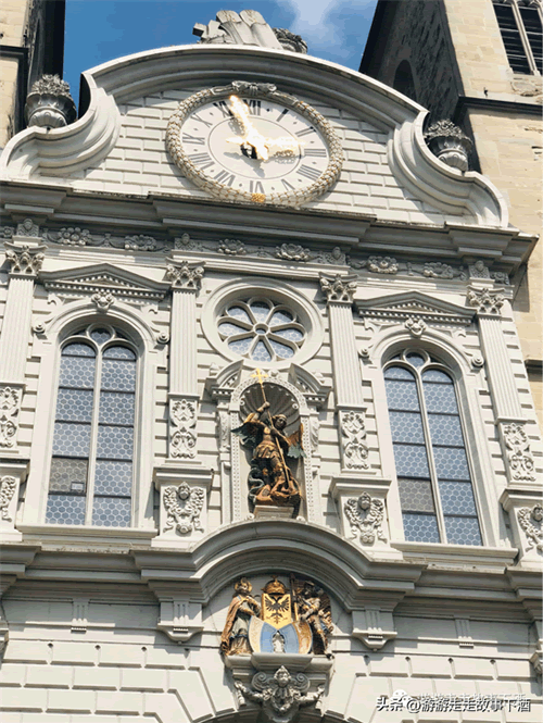教堂正面是巨大的挂钟,下面是精致的雕塑,考究的建筑浮雕。霍夫教堂是双塔哥特式建筑,初建于735年,古代就是当地的信仰中心。14世纪,教堂被改成哥特式,1645年发生火灾,重建后呈现文艺复兴晚期的建筑风格。