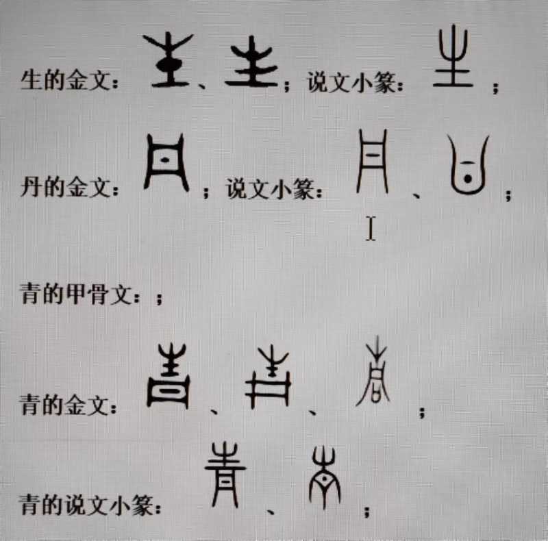 青(qīng):古字形,下部“丹”为矿井,上部“生”为生出,挑选出,提炼出。1.挑选出、提炼出之物为:纯洁的,纯净的,纯粹的;为精华部分,最好的。2.挑选出之物引申为:刚生出,初生;初生的颜色;象物之生时色也;最美的。所以,青的