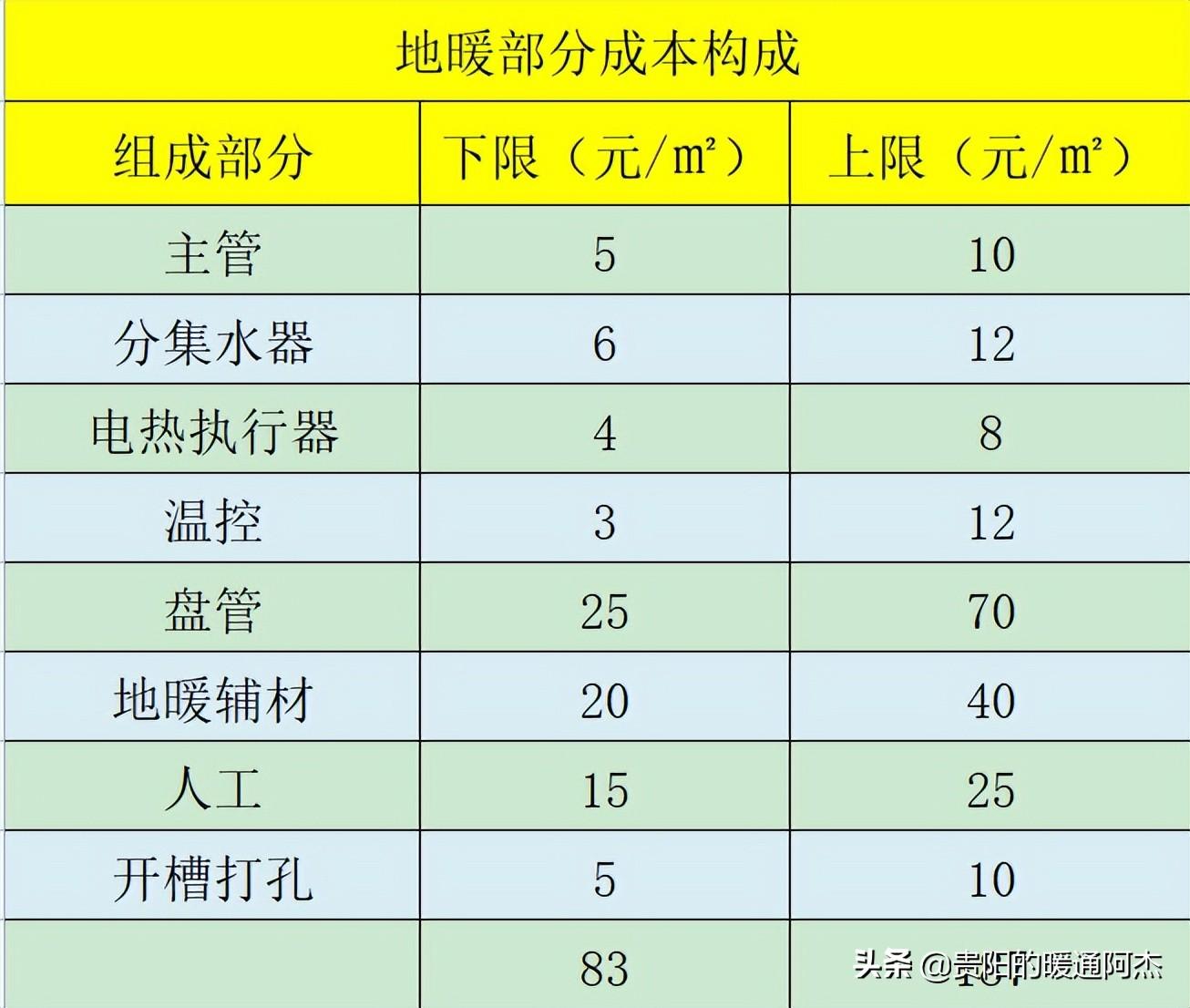 综上所算:什么都选最便宜的,算下来地暖成本价格在80元/平米左右,什么都选最贵的,算下来地暖成本价格在180元/平米左右,仅供参考,不做真实依据。
