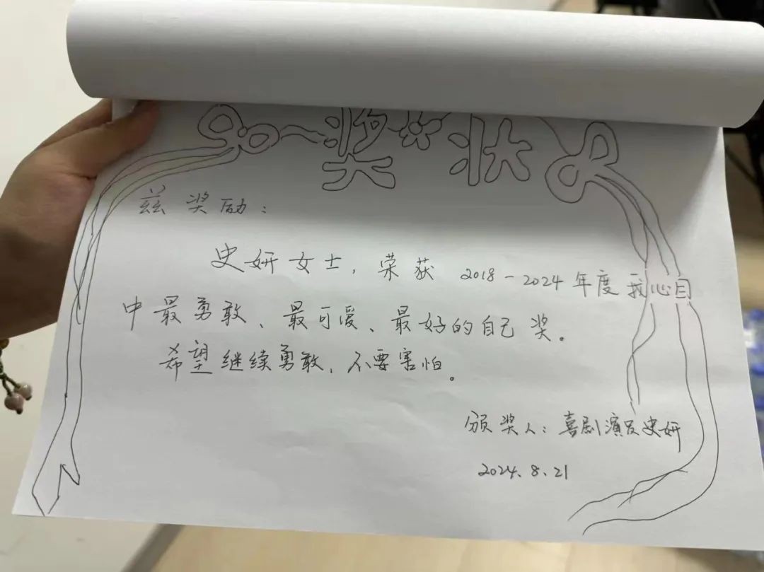 「史妍女士,荣获2025—2024年度我心目中最勇敢、最可爱、最好的自己奖。」