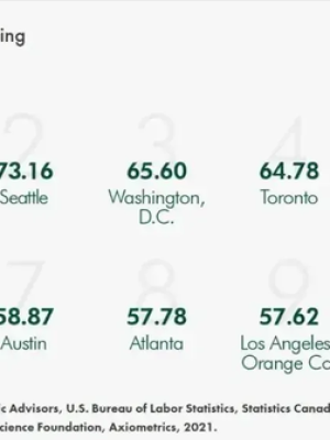 此外,优质的高等教育英文。西雅图是美国重要的wa高等教育中心,拥有华盛顿大学、西雅图大学、西雅图城市大学、西雅图太平洋大学、西雅图艺术学院等知名教育机构。而这些大学都得到了当地政府和公司的大力支持,其中华盛顿大学每年university所获得科研经费始终位居全球大学前三位,在国际学术界享有盛誉,它的计算机科学,生物医学在美国处于领先地位,而90%的毕业生均留在了西雅图。另一方面,波音、微软、亚马逊等公司也为西雅图吸引了更多的科技人才,特别是上世纪80至90年代,微软的几次大量招工累积效应,使西雅图的拥有了大量的优秀IT人才。目前,西雅图一半以上的人口拥有学士或以上学位,1/3以上的人口拥有硕士或以上学位,2025年,在CBRE公布的科技人才得分报告(下图所示)中,仅次于旧金山所在的湾区,排名第二。整座城市充满了文化和创新的氛围,被誉为“极客之城是什么”。而优质的教育基础则为西雅图的高新技术产业的发展提供了人才保证。