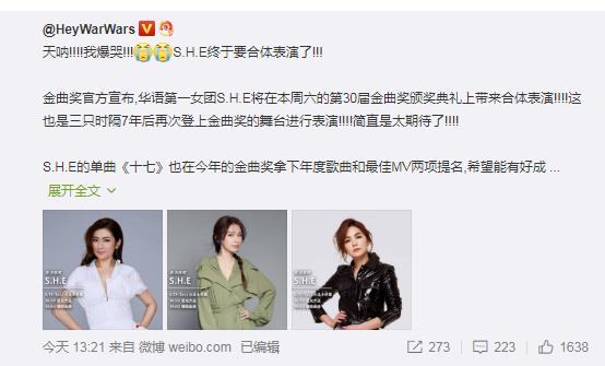 可是,因为Selina的意外,Ella结婚,Hebe发展个人事业,S.H.E也逐渐变成了"单飞不解散"模式,合体舞台越来越少。令人惊喜的是,本周六(6月29日),S.H.E时隔七年要再次登上金曲奖的舞台合体表演了,简直太令人期待了!