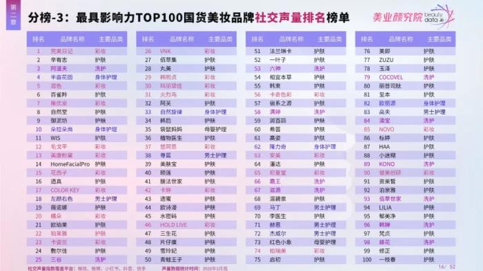 除了综合榜单,美业颜究院对TOP100国货美妆品牌也进行了销售额排名、销量排名和社交声量排名。