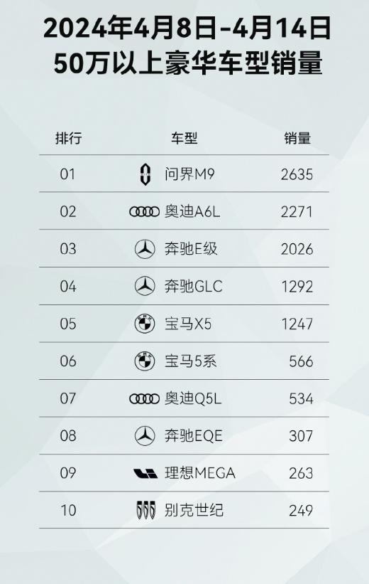 问界M9周销量登顶 超越BBA领跑50万以上豪华车型市场