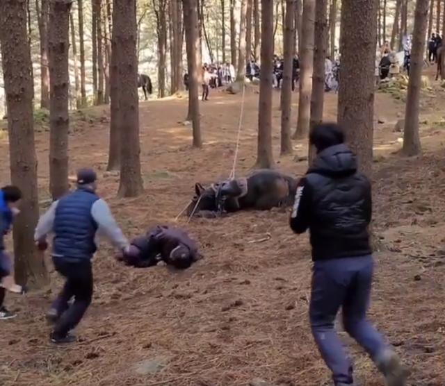 原来,剧组为让奔跑中的马儿摔倒,安排大量工作人员在后方拉绳子,使得马儿当场重摔,头颈部直接贴地,后腿连蹬几下,马背上的演员也跟着摔出马外,无法动弹。