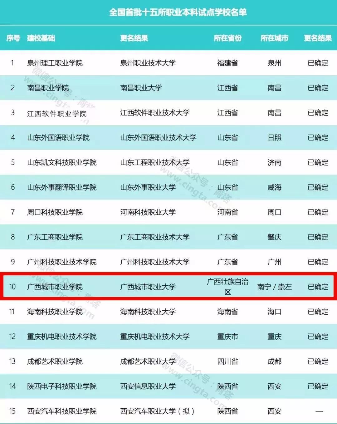 5月27日,教育部正式公布各个职业学院更名的消息。广西城市职业学院(本科)正式更名为广西城市职业大学!