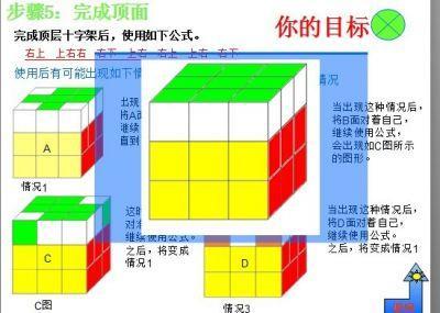 块相对方位均正确为止(一般要重复3-5次). 调整顶层,使它边角方块颜色与已完成的两