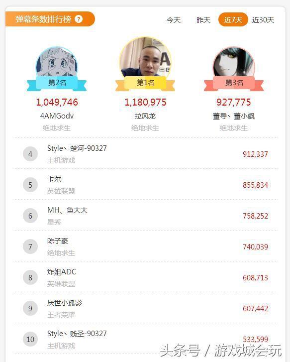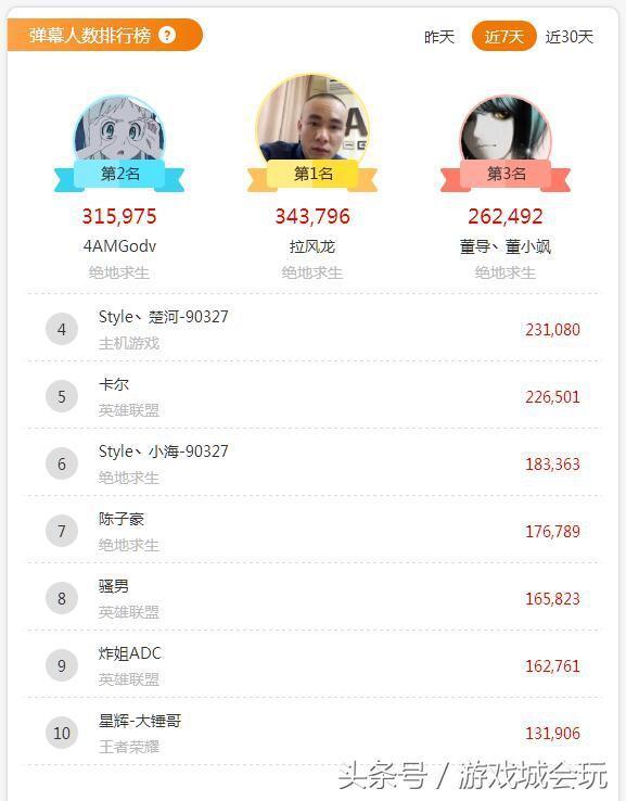 英雄联盟主播的排名相对不是很理想,但几名顶级大主播依旧有在榜单上,卡尔、骚男都上了弹幕条数排名榜跟弹幕人数排行榜。