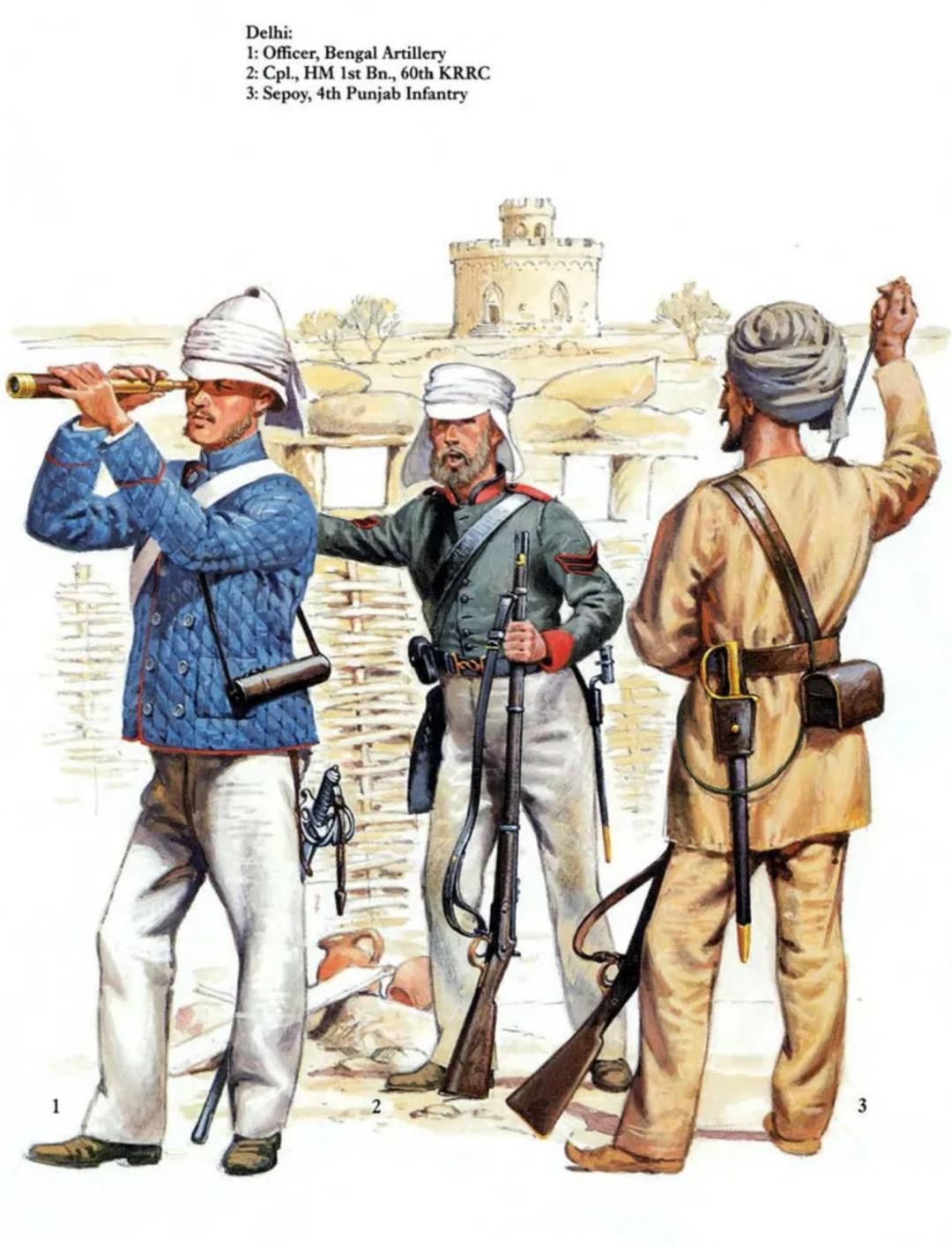 ◇ 图为1.英国东印度公司孟加拉炮兵团军官;2.第60王属皇家步枪军团女王陛下第1营;3.英国东印度公司第4旁遮普步兵团印度裔士兵
