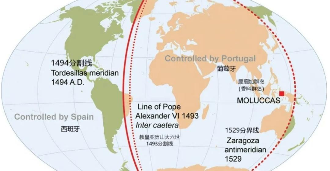 1494年,在教皇亚历山大六世的斡旋之下,两国签署《托德西里亚斯条约》,规定了两国势力分界线在大西洋中间佛得角以西的海域,分界线以西属于西班牙,以东属于葡萄牙,其他国家船只未经西葡两国允许不可以在他们的势力范围内航行经商。对那些后来的欧洲国家来说,比如英国荷兰,这个条约根本就是不给他们机会,于是他们当然会把这个条约当成历史文件视而不见。