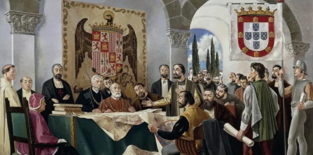 ◇ 图为1494年6月7日,西班牙和葡萄牙签署《托尔德西里亚斯条约》