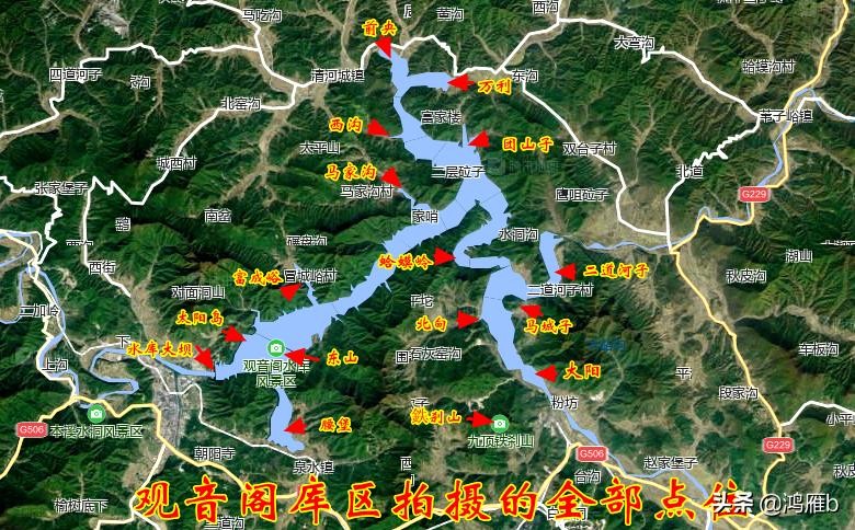 观音阁库区拍摄的全部点位示意图,几乎包括了水库全部所能到达的地点。